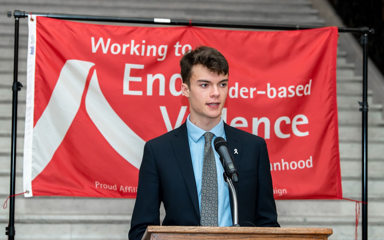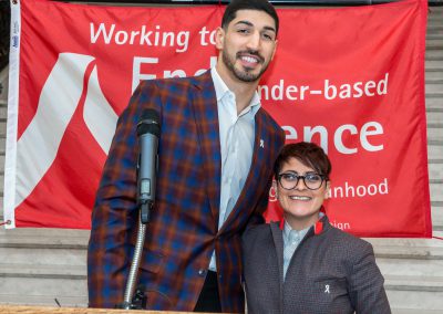 Boston, March 6 — Advocates, elected officials and community members filled the State House yesterday to join Jane Doe Inc. (JDI), the Massachusetts Coalition Against Sexual Assault and Domestic Violence, at the Massachusetts State House along with Governor Charlie Baker, Lt. Governor Karyn Polito, Enes Kanter of the Boston Celtics, National Association of Social Workers (NASW) Chief Executive Officer Angelo McClain, and student athletes from Hingham High School to launch JDI’s 2020 Massachusetts White Ribbon Day Campaign.