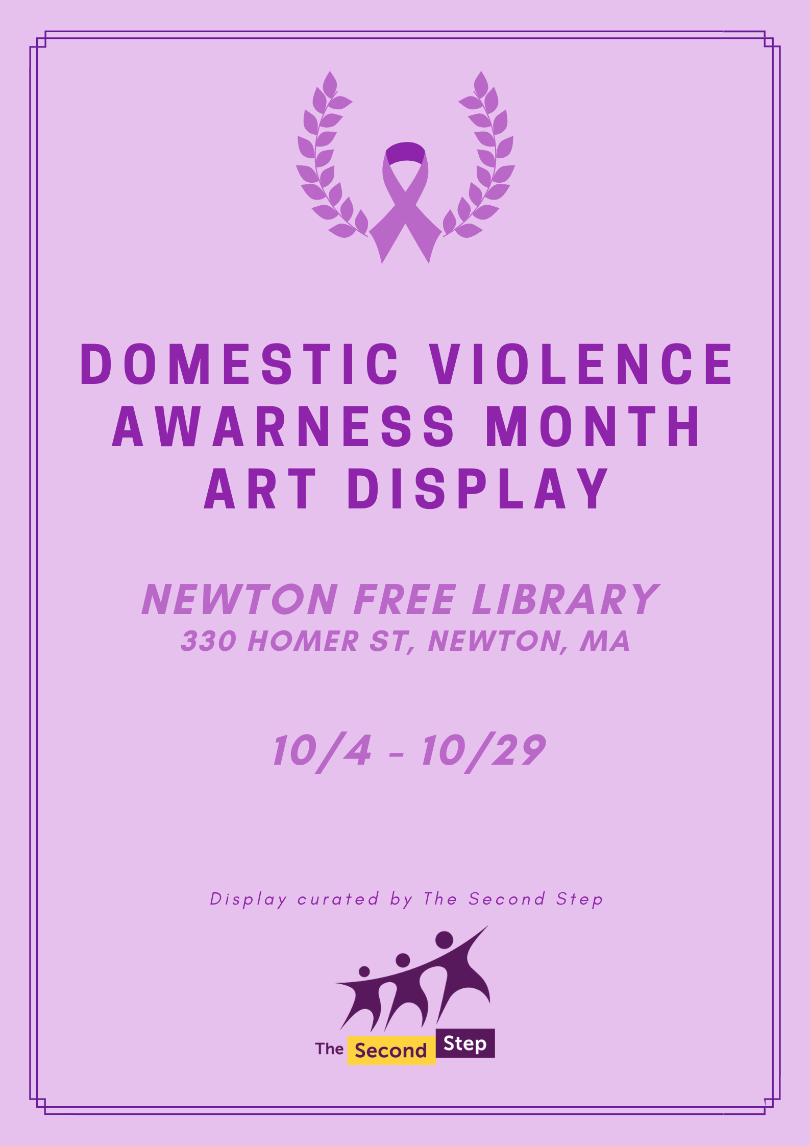 Support this full-month event curated by The Second Step designed for Domestic Violence Awareness Month. Walk in from 9am-6pm on weekdays or 9am-5pm/1pm-5pm on Saturdays and Sundays, respectively at the Newton Free Library.