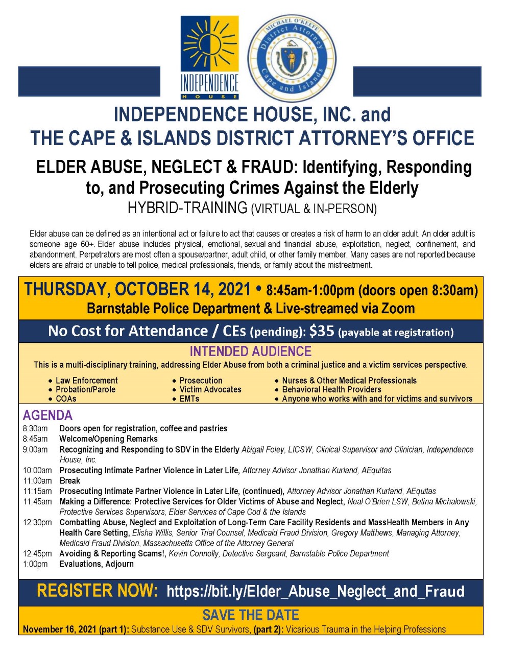 Join the Independence House, Inc. and the Cape & Islands District Attorney’s Office in their multi-disciplinary training addressing Elder Abuse from both a criminal justice and a victim services perspective. The event will be in person at the Barnstable Police Department as well as live streamed via zoom.